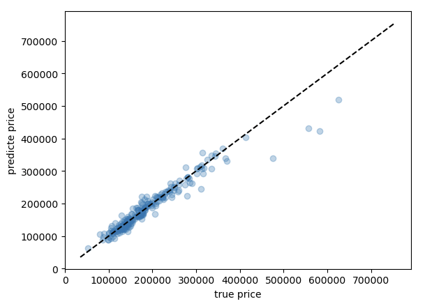 - The plot below shows the model can predict great when there are enough data for housing in similar prices. In other words, the model know more housing cases when the house price is below.