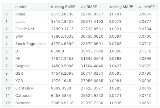 - MAPE for test dataset after submission was 0.12069