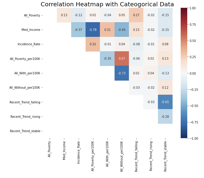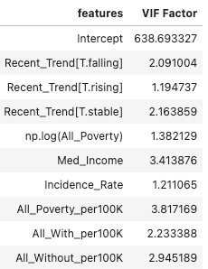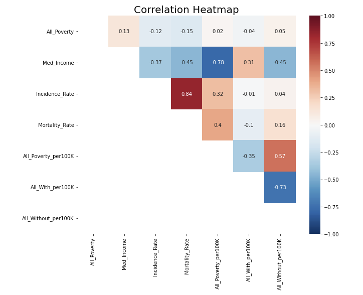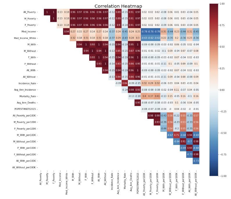 There are some features are highly correlated with each other, such as All_Poverty, M_Poverty, and F_Poverty. Removing those correlation can help reduce colinearity in linear regression models. So, I removed columns with correlation over 0.85 and kept the column having highest correlation with y variable (Mortality_Rate)