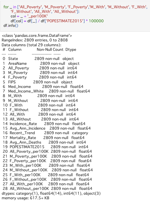 - Convert population number to rates by population for each county Some of the numerical variables are dependent on the populations, so it would be helpful for algoritgns by converting all the raw data to per 100,000 persons rates (divide by population and multiply by 100,000).
