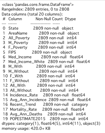 - 20+ variables related to each county and lung cancer mortality rate (y variable). Total 3,134 rows.